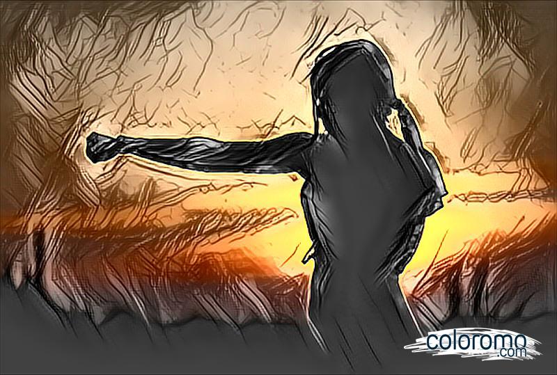 Behold a beautiful piece of art portraying a girl performing a karate kata, her fist striking against the powerful force of a hurricane.