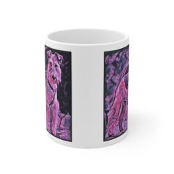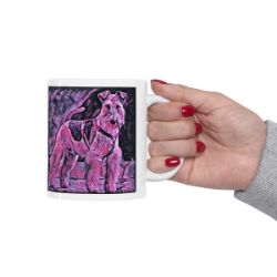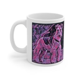 Keep cozy and warm with a nice cuppa, featuring the beloved Airedale Terrier dog breed stylized in our Coloromo Violet Femmes art on a ceramic mug. Lead and BPA-free, these durable mugs are also microwave & dishwasher-safe. Made of white, resilient ceramic in an 11-ounce size, this is the perfect gift for coffee, tea, and hot chocolate lovers.