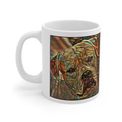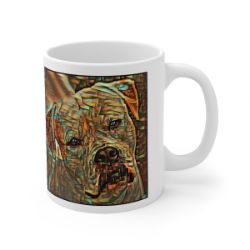 Keep cozy and warm with a nice cuppa, featuring the beloved American Bulldog dog breed stylized in our Coloromo Cool Cubist art on a ceramic mug. Lead and BPA-free, these durable mugs are also microwave & dishwasher-safe. Made of white, resilient ceramic in an 11-ounce size, this is the perfect gift for coffee, tea, and hot chocolate lovers.
