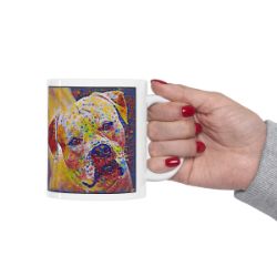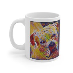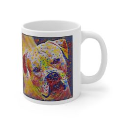 Keep cozy and warm with a nice cuppa, featuring the beloved American Bulldog dog breed stylized in our Coloromo Party Confetti art on a ceramic mug. Lead and BPA-free, these durable mugs are also microwave & dishwasher-safe. Made of white, resilient ceramic in an 11-ounce size, this is the perfect gift for coffee, tea, and hot chocolate lovers.