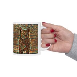 Keep cozy and warm with a nice cuppa, featuring the beloved Australian Kelpie dog breed stylized in our Coloromo Cool Cubist art on a ceramic mug. Lead and BPA-free, these durable mugs are also microwave & dishwasher-safe. Made of white, resilient ceramic in an 11-ounce size, this is the perfect gift for coffee, tea, and hot chocolate lovers.