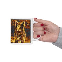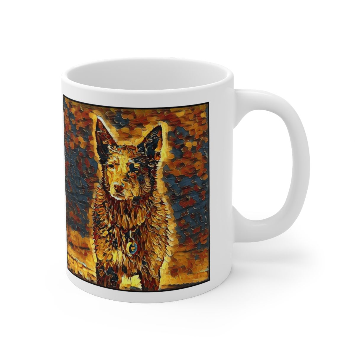 Keep cozy and warm with a nice cuppa, featuring the beloved Australian Kelpie dog breed stylized in our Coloromo Painterly art on a ceramic mug. Lead and BPA-free, these durable mugs are also microwave & dishwasher-safe. Made of white, resilient ceramic in an 11-ounce size, this is the perfect gift for coffee, tea, and hot chocolate lovers.