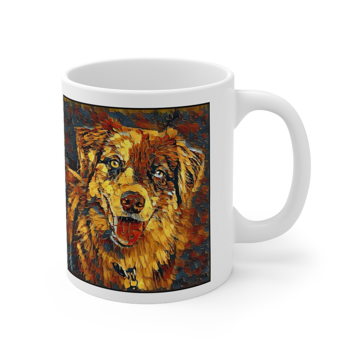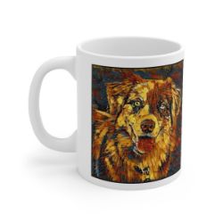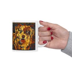Keep cozy and warm with a nice cuppa, featuring the beloved Australian Shepherd dog breed stylized in our Coloromo Painterly art on a ceramic mug. Lead and BPA-free, these durable mugs are also microwave & dishwasher-safe. Made of white, resilient ceramic in an 11-ounce size, this is the perfect gift for coffee, tea, and hot chocolate lovers.