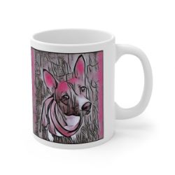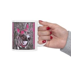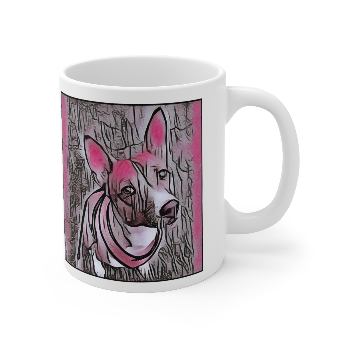 Keep cozy and warm with a nice cuppa, featuring the beloved Basenji dog breed stylized in our Coloromo Comic Pink art on a ceramic mug. Lead and BPA-free, these durable mugs are also microwave & dishwasher-safe. Made of white, resilient ceramic in an 11-ounce size, this is the perfect gift for coffee, tea, and hot chocolate lovers.