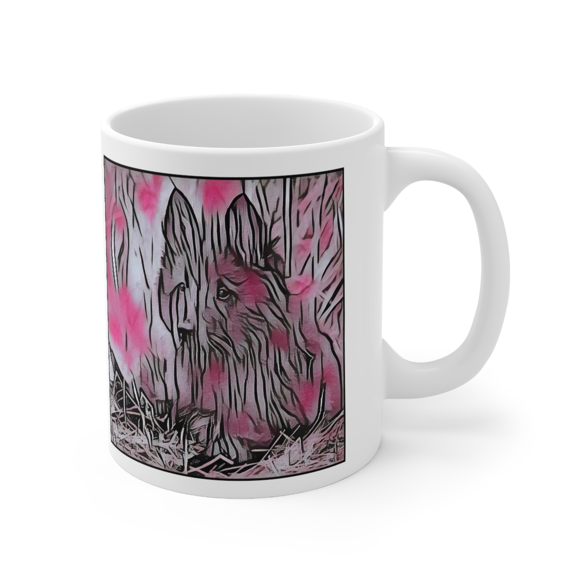 Keep cozy and warm with a nice cuppa, featuring the beloved Belgian Sheepdog Belgian Shepherd dog breed stylized in our Coloromo Comic Pink art on a ceramic mug. Lead and BPA-free, these durable mugs are also microwave & dishwasher-safe. Made of white, resilient ceramic in an 11-ounce size, this is the perfect gift for coffee, tea, and hot chocolate lovers.