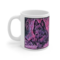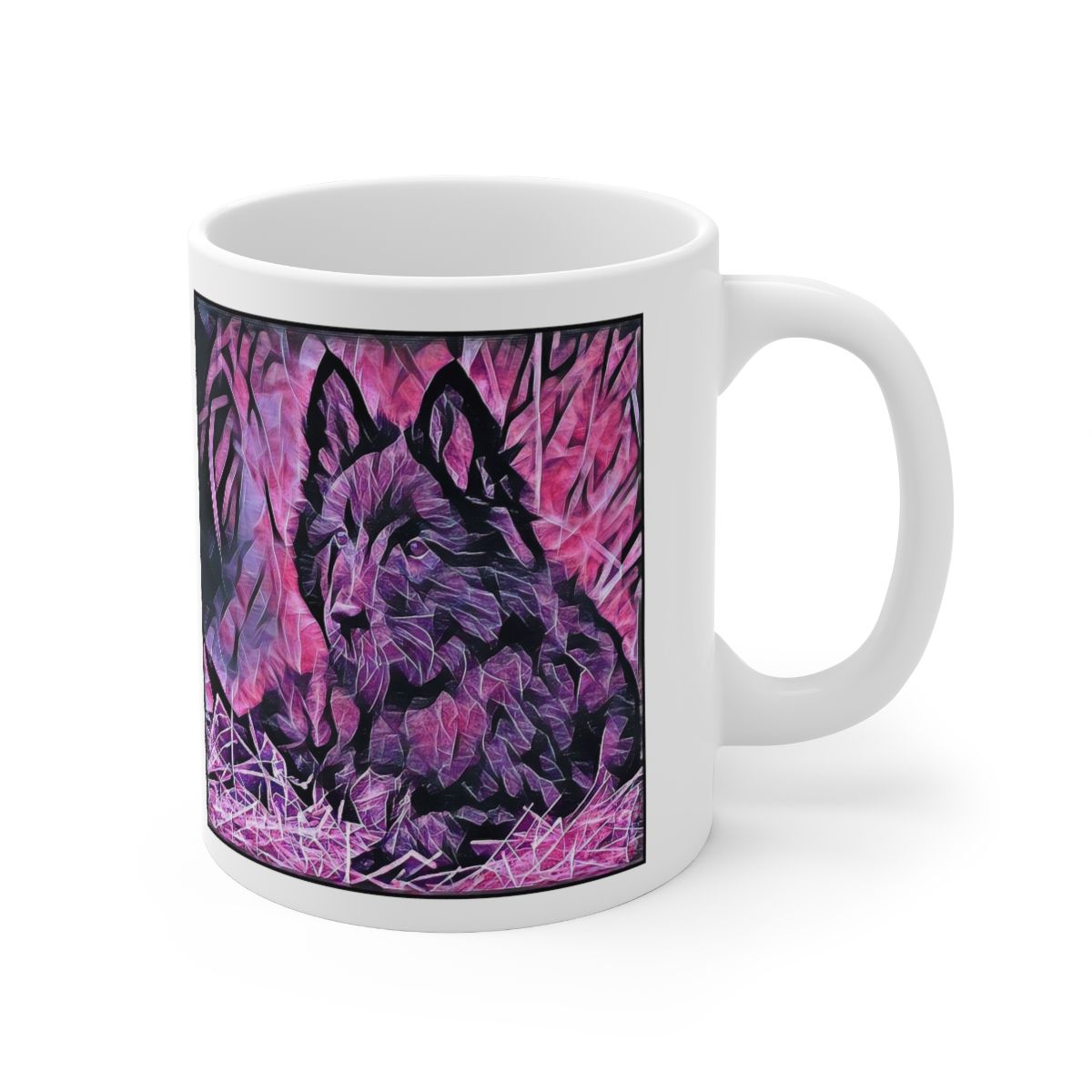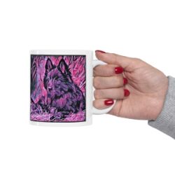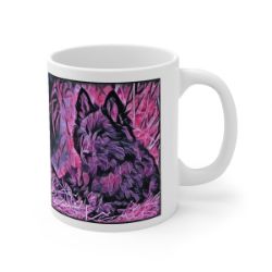 Keep cozy and warm with a nice cuppa, featuring the beloved Belgian Sheepdog Belgian Shepherd dog breed stylized in our Coloromo Violet Femmes art on a ceramic mug. Lead and BPA-free, these durable mugs are also microwave & dishwasher-safe. Made of white, resilient ceramic in an 11-ounce size, this is the perfect gift for coffee, tea, and hot chocolate lovers.