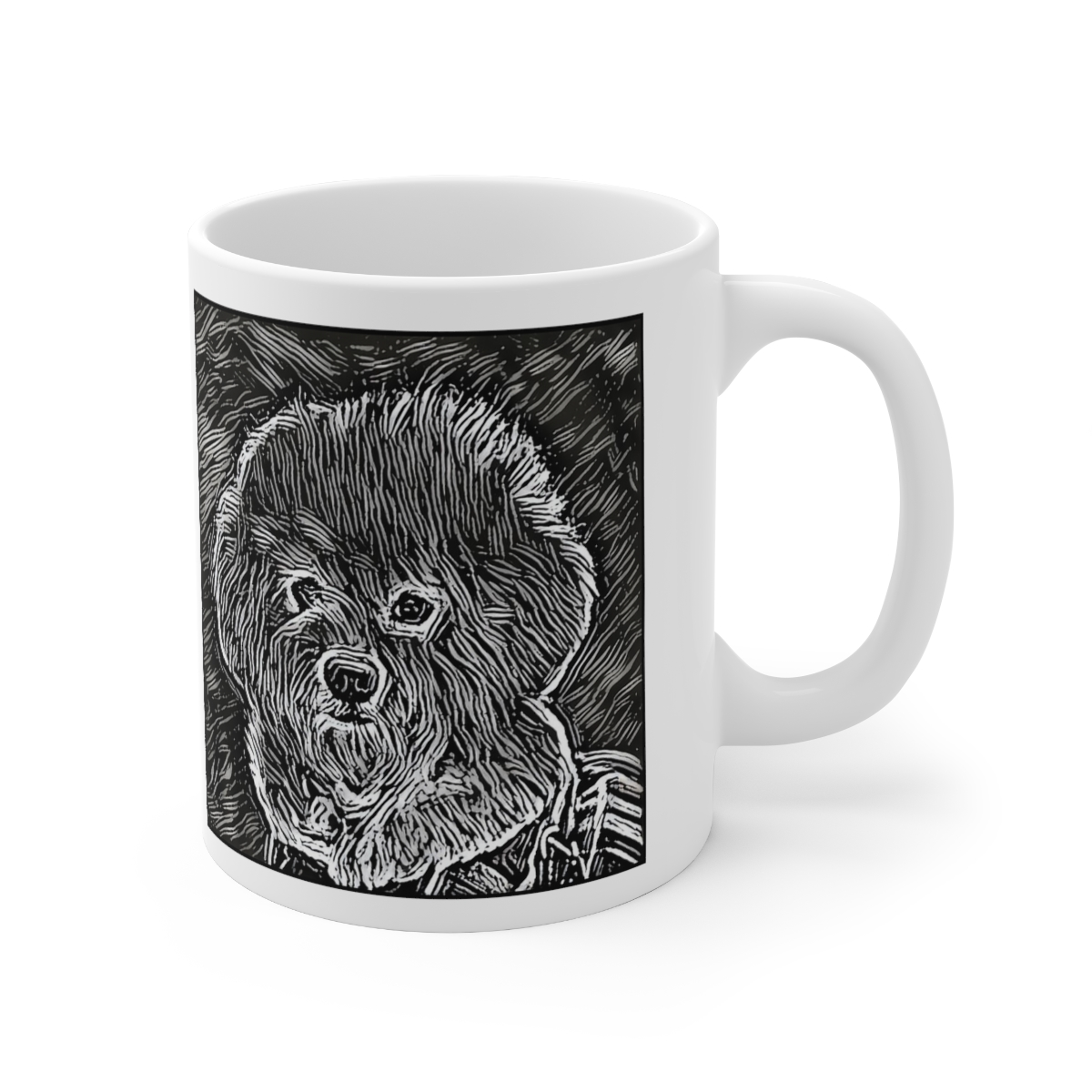 Keep cozy and warm with a nice cuppa, featuring the beloved Bichon Frise dog breed stylized in our Coloromo Licorice Lines art on a ceramic mug. Lead and BPA-free, these durable mugs are also microwave & dishwasher-safe. Made of white, resilient ceramic in an 11-ounce size, this is the perfect gift for coffee, tea, and hot chocolate lovers.