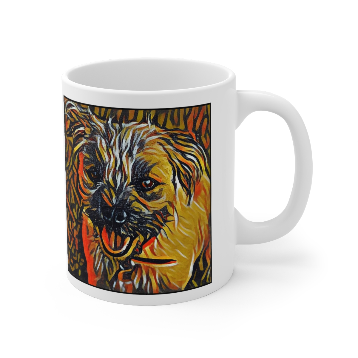 Keep cozy and warm with a nice cuppa, featuring the beloved Border Terrier dog breed stylized in our Coloromo Graffiti Haus art on a ceramic mug. Lead and BPA-free, these durable mugs are also microwave & dishwasher-safe. Made of white, resilient ceramic in an 11-ounce size, this is the perfect gift for coffee, tea, and hot chocolate lovers.