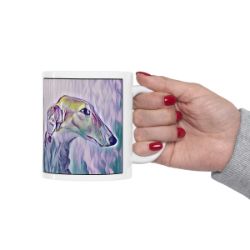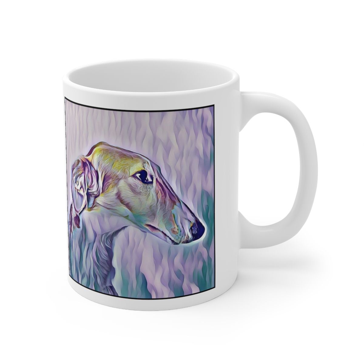 Keep cozy and warm with a nice cuppa, featuring the beloved Borzoi dog breed stylized in our Coloromo Lavender Ice art on a ceramic mug. Lead and BPA-free, these durable mugs are also microwave & dishwasher-safe. Made of white, resilient ceramic in an 11-ounce size, this is the perfect gift for coffee, tea, and hot chocolate lovers.