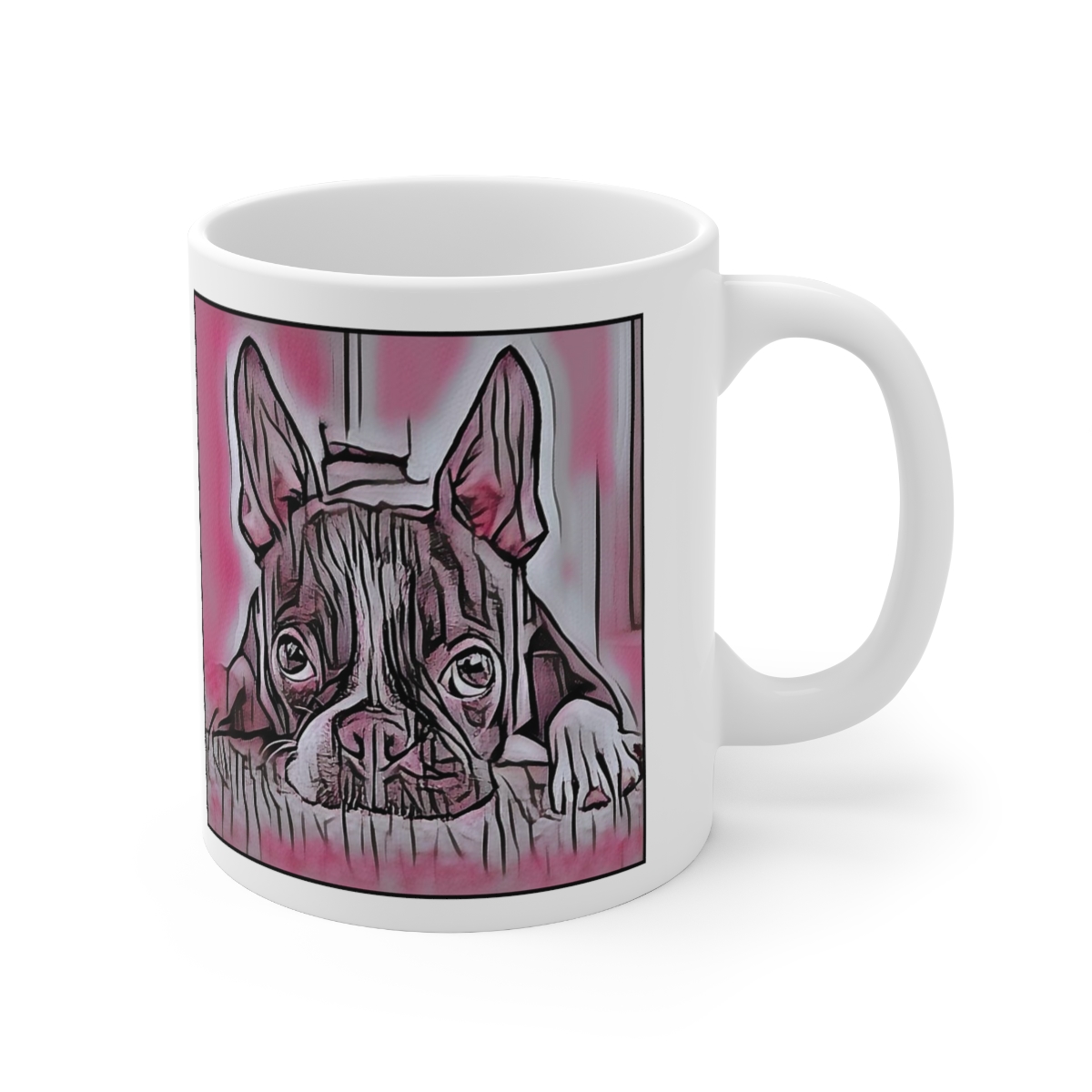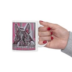 Keep cozy and warm with a nice cuppa, featuring the beloved Boston Terrier dog breed stylized in our Coloromo Comic Pink art on a ceramic mug. Lead and BPA-free, these durable mugs are also microwave & dishwasher-safe. Made of white, resilient ceramic in an 11-ounce size, this is the perfect gift for coffee, tea, and hot chocolate lovers.