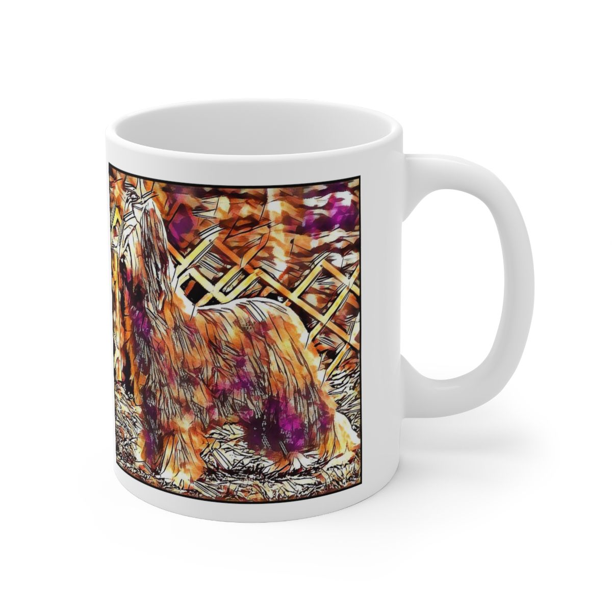 Keep cozy and warm with a nice cuppa, featuring the beloved Briard dog breed stylized in our Coloromo Hipster art on a ceramic mug. Lead and BPA-free, these durable mugs are also microwave & dishwasher-safe. Made of white, resilient ceramic in an 11-ounce size, this is the perfect gift for coffee, tea, and hot chocolate lovers.