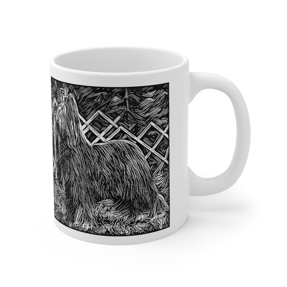 Keep cozy and warm with a nice cuppa, featuring the beloved Briard dog breed stylized in our Coloromo Licorice Lines art on a ceramic mug. Lead and BPA-free, these durable mugs are also microwave & dishwasher-safe. Made of white, resilient ceramic in an 11-ounce size, this is the perfect gift for coffee, tea, and hot chocolate lovers.