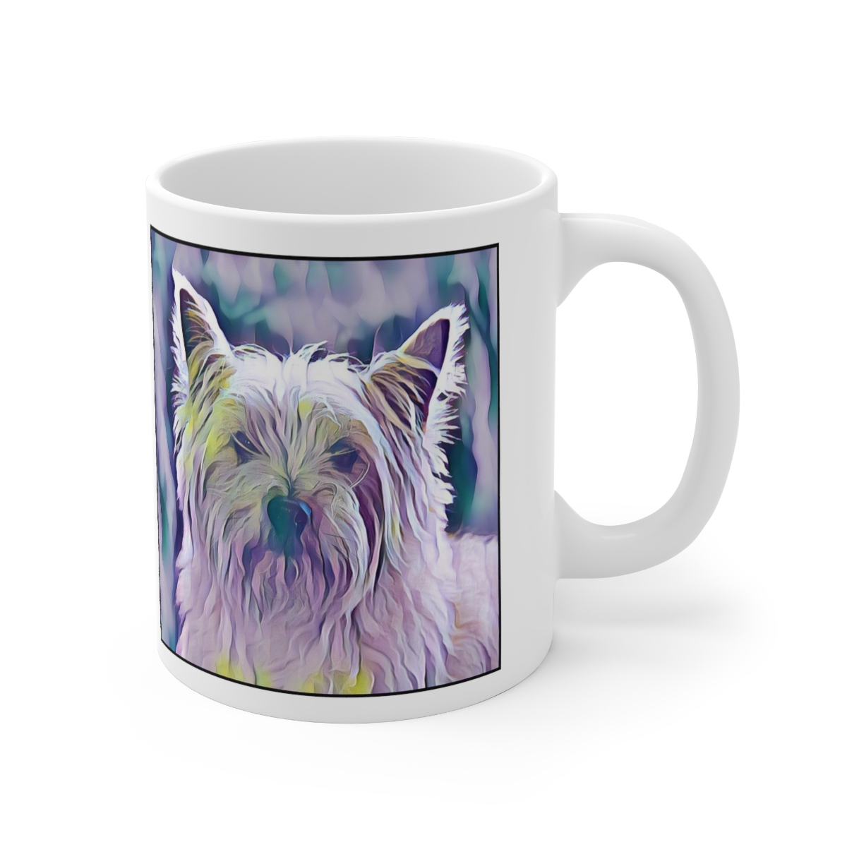 Keep cozy and warm with a nice cuppa, featuring the beloved Cairn Terrier dog breed stylized in our Coloromo Lavender Ice art on a ceramic mug. Lead and BPA-free, these durable mugs are also microwave & dishwasher-safe. Made of white, resilient ceramic in an 11-ounce size, this is the perfect gift for coffee, tea, and hot chocolate lovers.