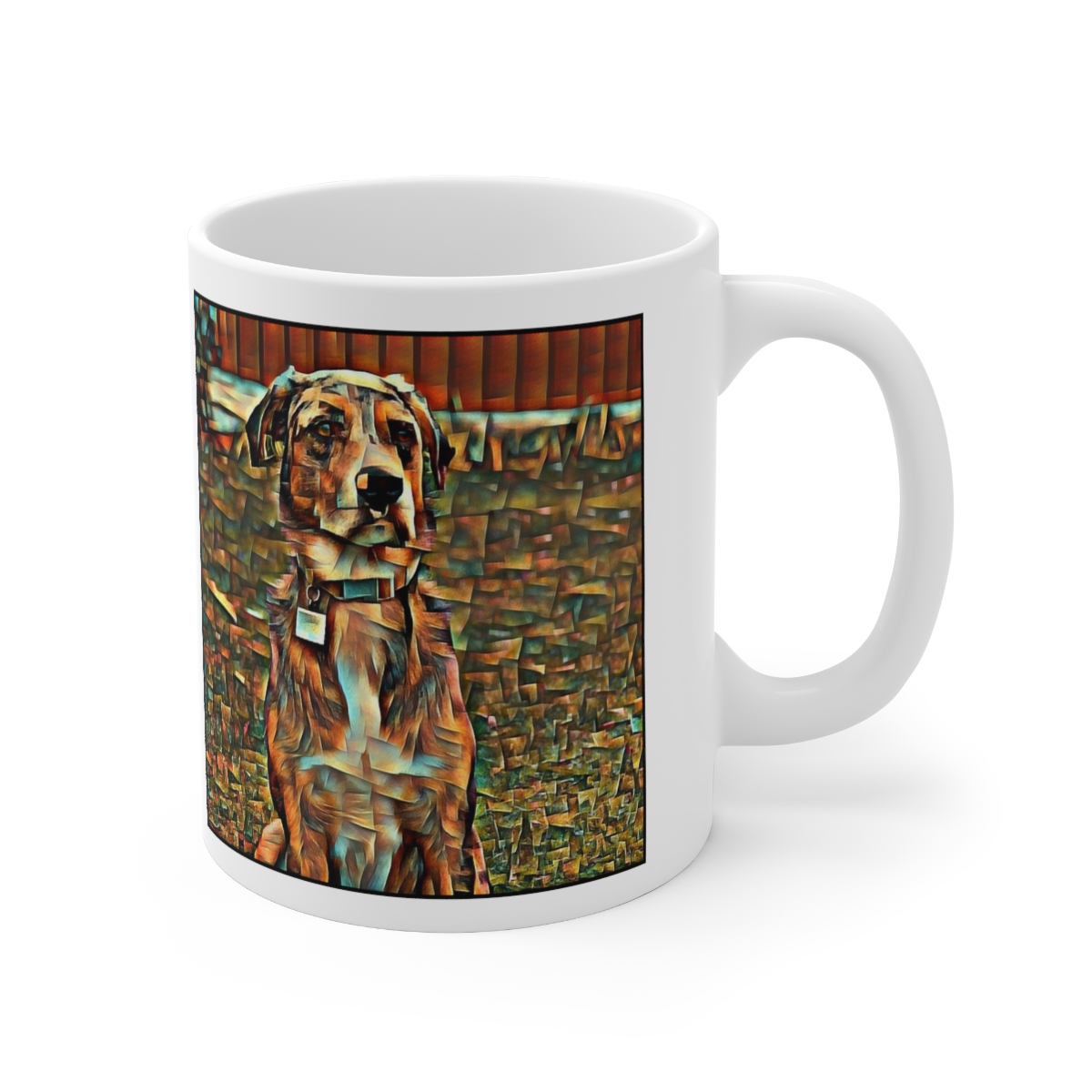 Keep cozy and warm with a nice cuppa, featuring the beloved Catahoula Leopard Dog dog breed stylized in our Coloromo Cool Cubist art on a ceramic mug. Lead and BPA-free, these durable mugs are also microwave & dishwasher-safe. Made of white, resilient ceramic in an 11-ounce size, this is the perfect gift for coffee, tea, and hot chocolate lovers.