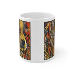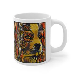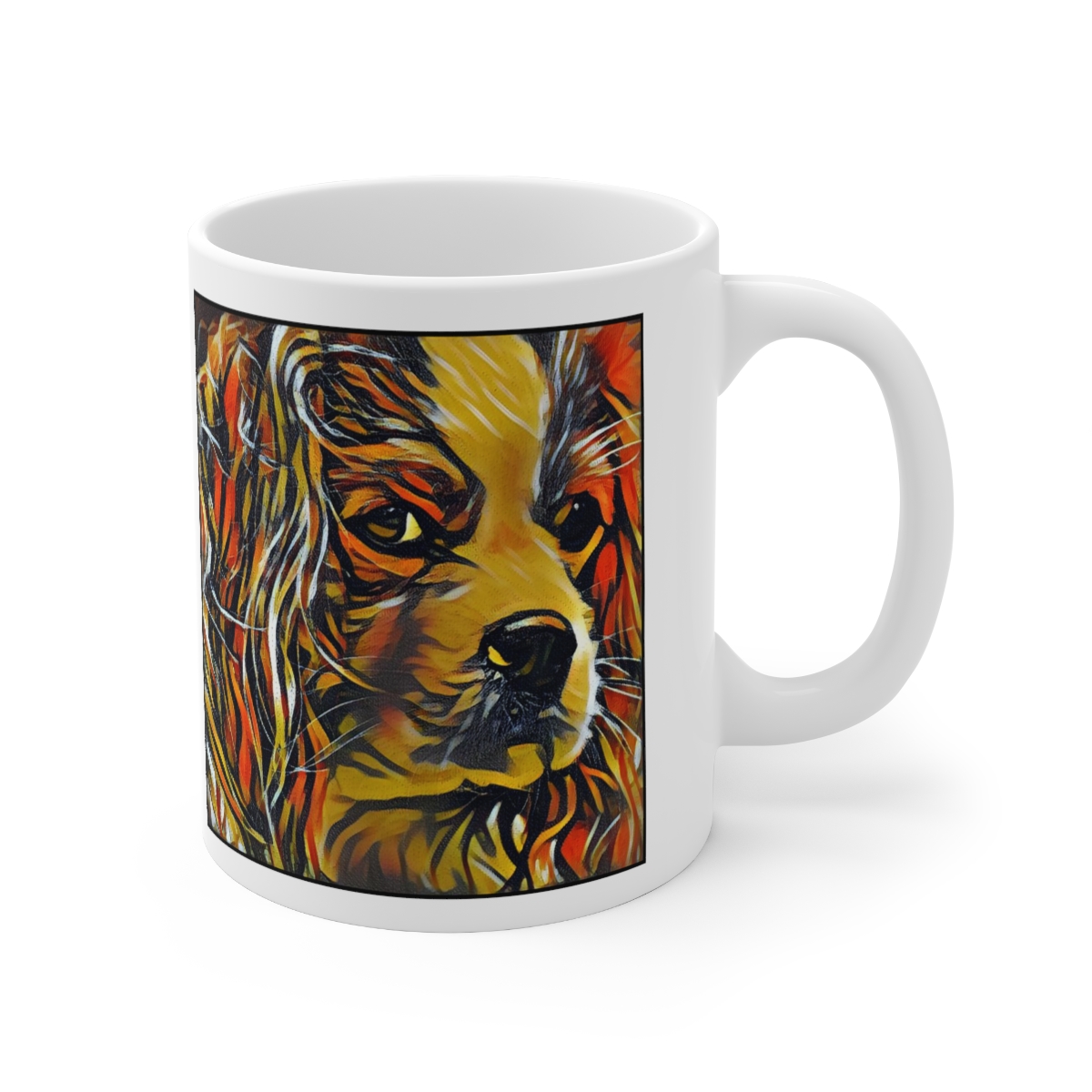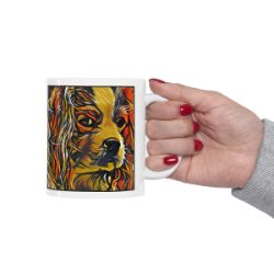 Keep cozy and warm with a nice cuppa, featuring the beloved Cavalier King Charles Spaniel dog breed stylized in our Coloromo Graffiti Haus art on a ceramic mug. Lead and BPA-free, these durable mugs are also microwave & dishwasher-safe. Made of white, resilient ceramic in an 11-ounce size, this is the perfect gift for coffee, tea, and hot chocolate lovers.