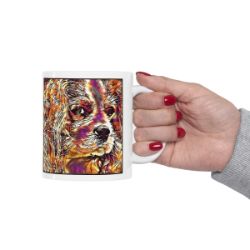Keep cozy and warm with a nice cuppa, featuring the beloved Cavalier King Charles Spaniel dog breed stylized in our Coloromo Hipster art on a ceramic mug. Lead and BPA-free, these durable mugs are also microwave & dishwasher-safe. Made of white, resilient ceramic in an 11-ounce size, this is the perfect gift for coffee, tea, and hot chocolate lovers.