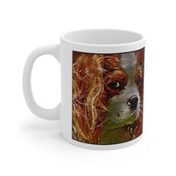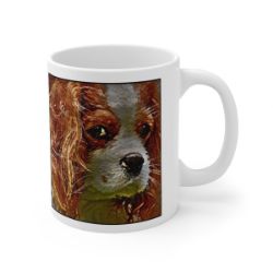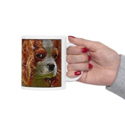 Keep cozy and warm with a nice cuppa, featuring the beloved Cavalier King Charles Spaniel dog breed stylized in our Coloromo Lord Lil Bit art on a ceramic mug. Lead and BPA-free, these durable mugs are also microwave & dishwasher-safe. Made of white, resilient ceramic in an 11-ounce size, this is the perfect gift for coffee, tea, and hot chocolate lovers.
