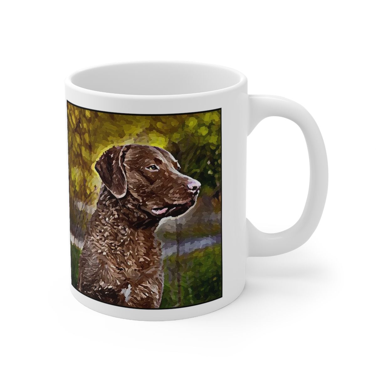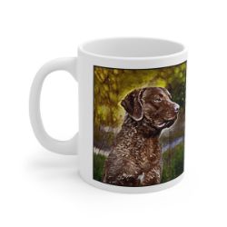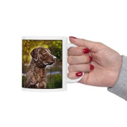 Keep cozy and warm with a nice cuppa, featuring the beloved Chesapeake Retriever dog breed stylized in our Coloromo Lord Lil Bit art on a ceramic mug. Lead and BPA-free, these durable mugs are also microwave & dishwasher-safe. Made of white, resilient ceramic in an 11-ounce size, this is the perfect gift for coffee, tea, and hot chocolate lovers.