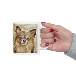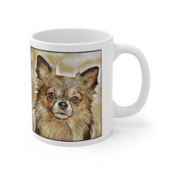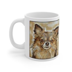 Keep cozy and warm with a nice cuppa, featuring the beloved Chihuahua Long Hair dog breed stylized in our Coloromo Hairy Styles art on a ceramic mug. Lead and BPA-free, these durable mugs are also microwave & dishwasher-safe. Made of white, resilient ceramic in an 11-ounce size, this is the perfect gift for coffee, tea, and hot chocolate lovers.
