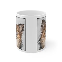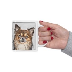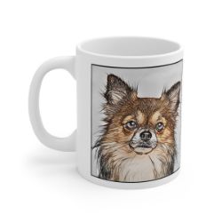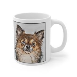 Keep cozy and warm with a nice cuppa, featuring the beloved Chihuahua Long Hair dog breed stylized in our Coloromo Penciled In art on a ceramic mug. Lead and BPA-free, these durable mugs are also microwave & dishwasher-safe. Made of white, resilient ceramic in an 11-ounce size, this is the perfect gift for coffee, tea, and hot chocolate lovers.