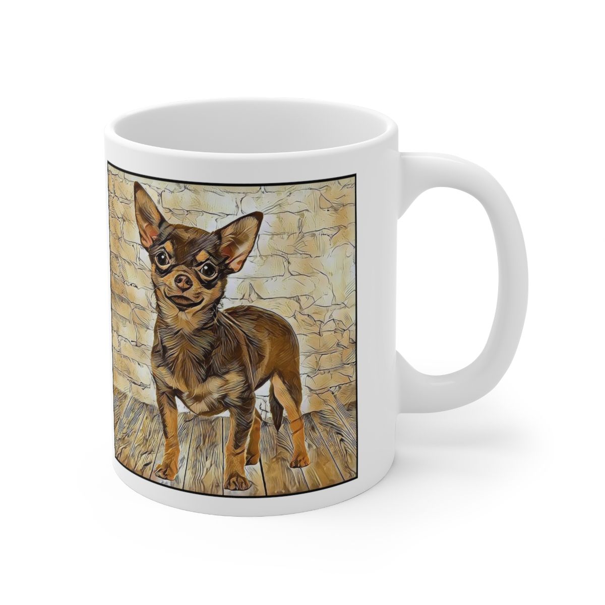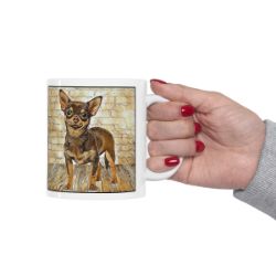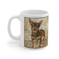 Keep cozy and warm with a nice cuppa, featuring the beloved Chihuahua Smooth Coat dog breed stylized in our Coloromo Hairy Styles art on a ceramic mug. Lead and BPA-free, these durable mugs are also microwave & dishwasher-safe. Made of white, resilient ceramic in an 11-ounce size, this is the perfect gift for coffee, tea, and hot chocolate lovers.