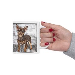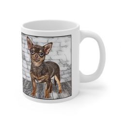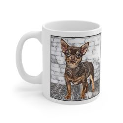 Keep cozy and warm with a nice cuppa, featuring the beloved Chihuahua Smooth Coat dog breed stylized in our Coloromo Penciled In art on a ceramic mug. Lead and BPA-free, these durable mugs are also microwave & dishwasher-safe. Made of white, resilient ceramic in an 11-ounce size, this is the perfect gift for coffee, tea, and hot chocolate lovers.