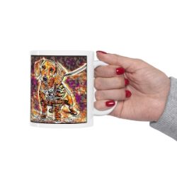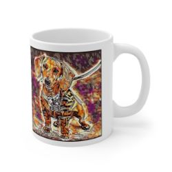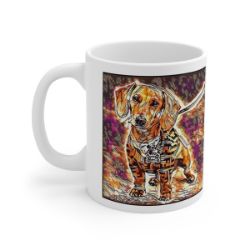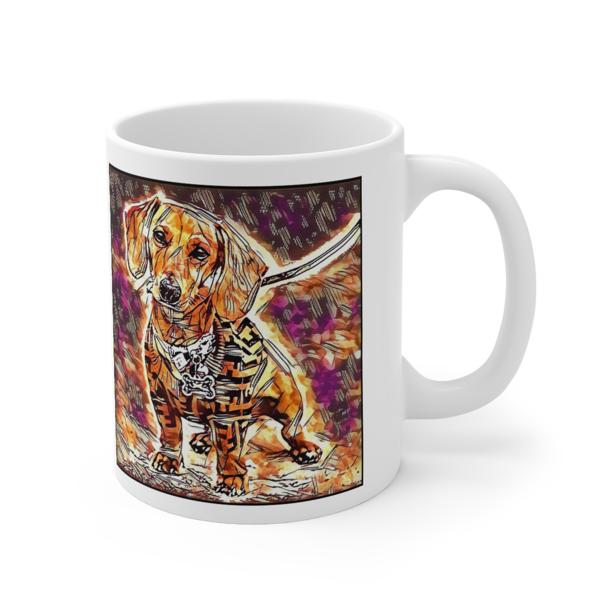 Keep cozy and warm with a nice cuppa, featuring the beloved Dachshund dog breed stylized in our Coloromo Hipster art on a ceramic mug. Lead and BPA-free, these durable mugs are also microwave & dishwasher-safe. Made of white, resilient ceramic in an 11-ounce size, this is the perfect gift for coffee, tea, and hot chocolate lovers.