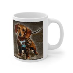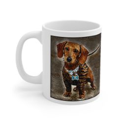 Keep cozy and warm with a nice cuppa, featuring the beloved Dachshund dog breed stylized in our Coloromo Lord Lil Bit art on a ceramic mug. Lead and BPA-free, these durable mugs are also microwave & dishwasher-safe. Made of white, resilient ceramic in an 11-ounce size, this is the perfect gift for coffee, tea, and hot chocolate lovers.