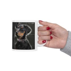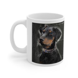 Keep cozy and warm with a nice cuppa, featuring the beloved Doberman dog breed stylized in our Coloromo Rock Candy art on a ceramic mug. Lead and BPA-free, these durable mugs are also microwave & dishwasher-safe. Made of white, resilient ceramic in an 11-ounce size, this is the perfect gift for coffee, tea, and hot chocolate lovers.