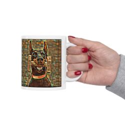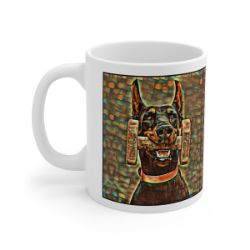 Keep cozy and warm with a nice cuppa, featuring the beloved Doberman cropped dog breed stylized in our Coloromo Cool Cubist art on a ceramic mug. Lead and BPA-free, these durable mugs are also microwave & dishwasher-safe. Made of white, resilient ceramic in an 11-ounce size, this is the perfect gift for coffee, tea, and hot chocolate lovers.