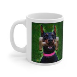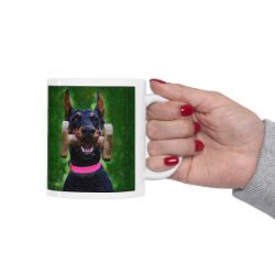 Keep cozy and warm with a nice cuppa, featuring the beloved Doberman cropped dog breed stylized in our Coloromo Rock Candy art on a ceramic mug. Lead and BPA-free, these durable mugs are also microwave & dishwasher-safe. Made of white, resilient ceramic in an 11-ounce size, this is the perfect gift for coffee, tea, and hot chocolate lovers.
