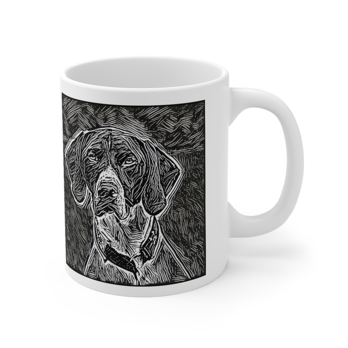 Keep cozy and warm with a nice cuppa, featuring the beloved German Shorthaired Pointer dog breed stylized in our Coloromo Licorice Lines art on a ceramic mug. Lead and BPA-free, these durable mugs are also microwave & dishwasher-safe. Made of white, resilient ceramic in an 11-ounce size, this is the perfect gift for coffee, tea, and hot chocolate lovers.