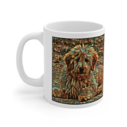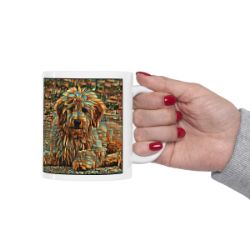 Keep cozy and warm with a nice cuppa, featuring the beloved Golden Doodle dog breed stylized in our Coloromo Cool Cubist art on a ceramic mug. Lead and BPA-free, these durable mugs are also microwave & dishwasher-safe. Made of white, resilient ceramic in an 11-ounce size, this is the perfect gift for coffee, tea, and hot chocolate lovers.