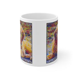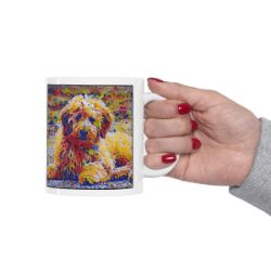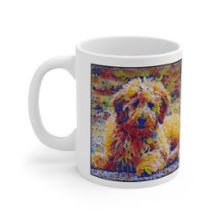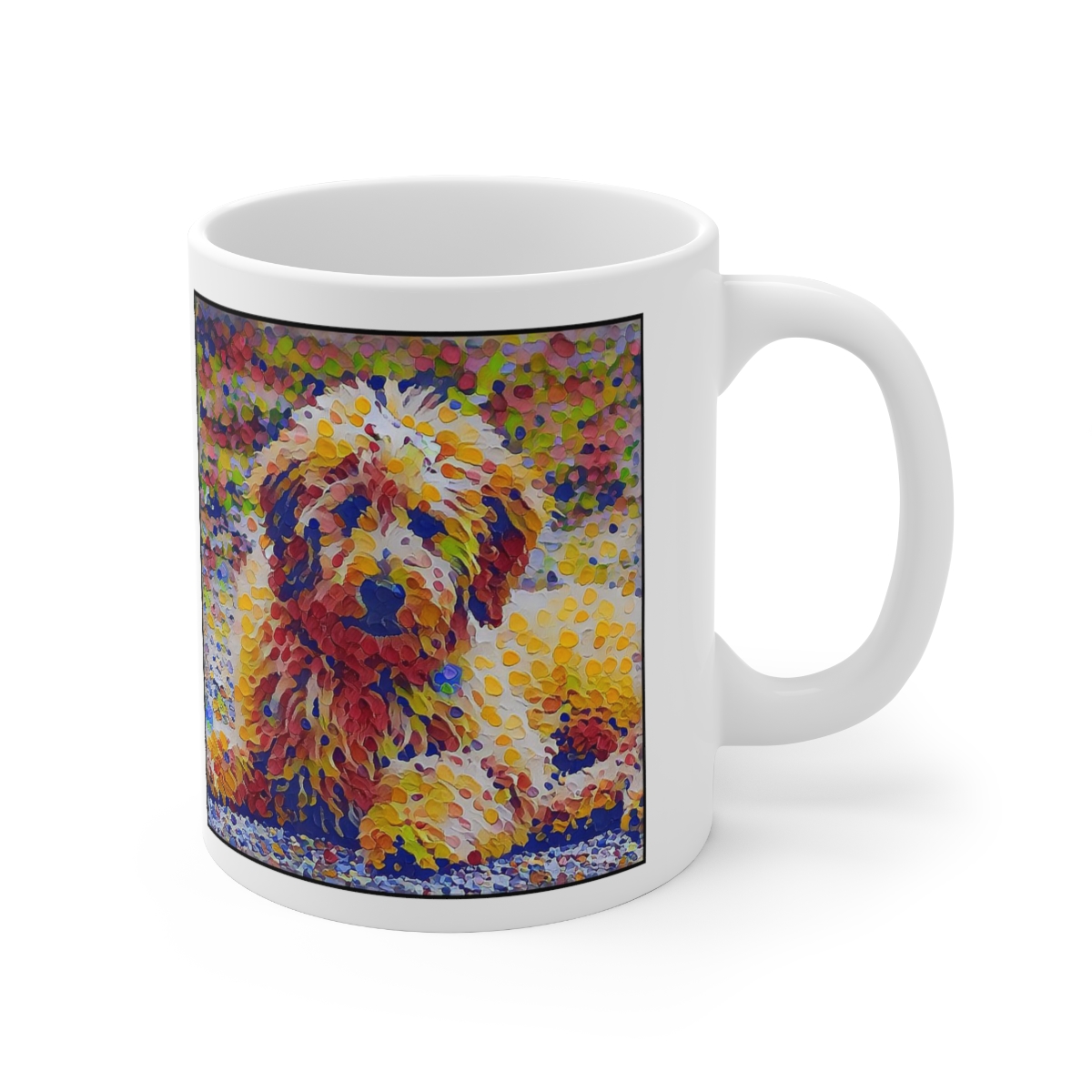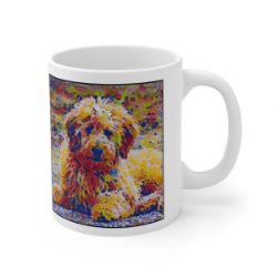 Keep cozy and warm with a nice cuppa, featuring the beloved Golden Doodle dog breed stylized in our Coloromo Party Confetti art on a ceramic mug. Lead and BPA-free, these durable mugs are also microwave & dishwasher-safe. Made of white, resilient ceramic in an 11-ounce size, this is the perfect gift for coffee, tea, and hot chocolate lovers.