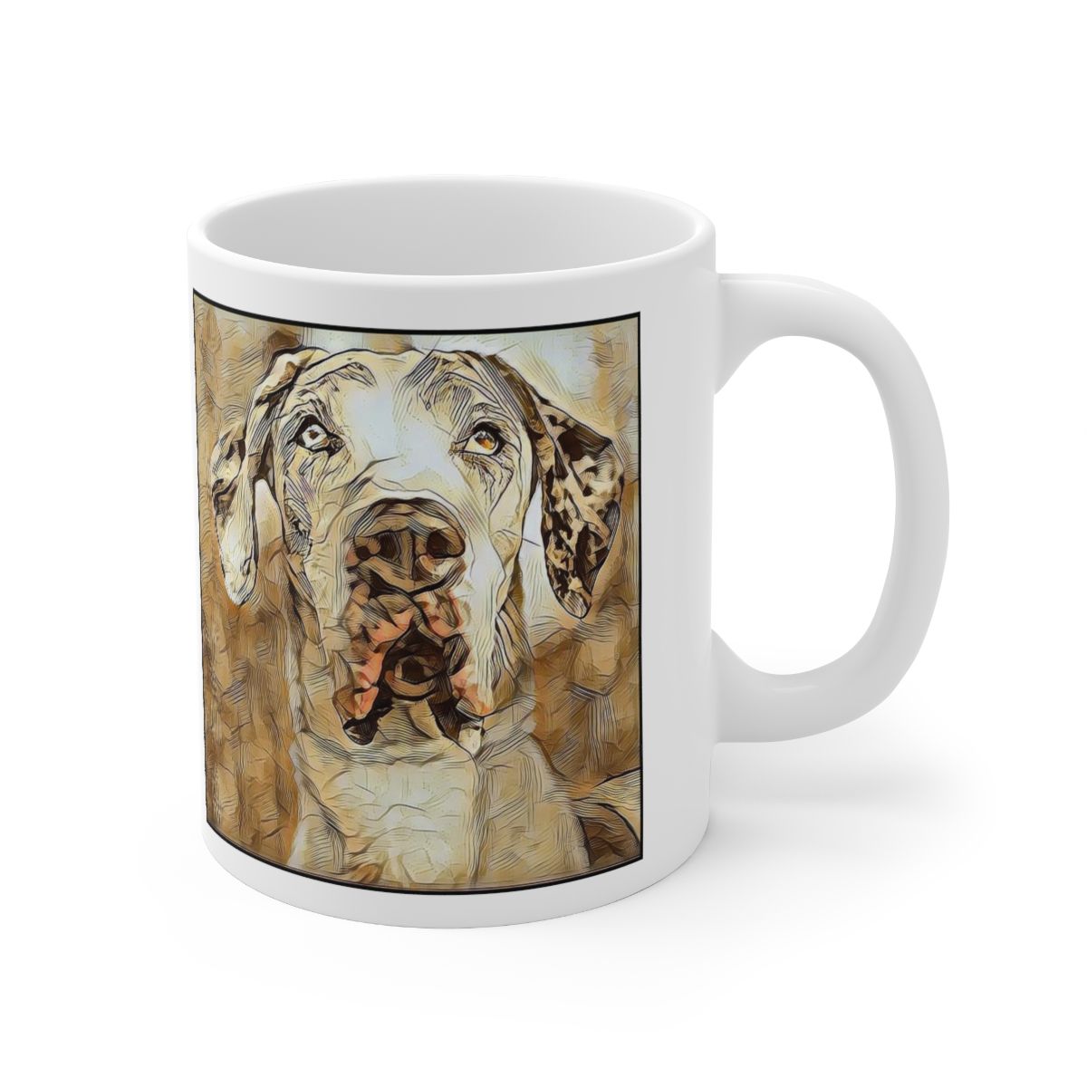 Keep cozy and warm with a nice cuppa, featuring the beloved Great Dane dog breed stylized in our Coloromo Hairy Styles art on a ceramic mug. Lead and BPA-free, these durable mugs are also microwave & dishwasher-safe. Made of white, resilient ceramic in an 11-ounce size, this is the perfect gift for coffee, tea, and hot chocolate lovers.