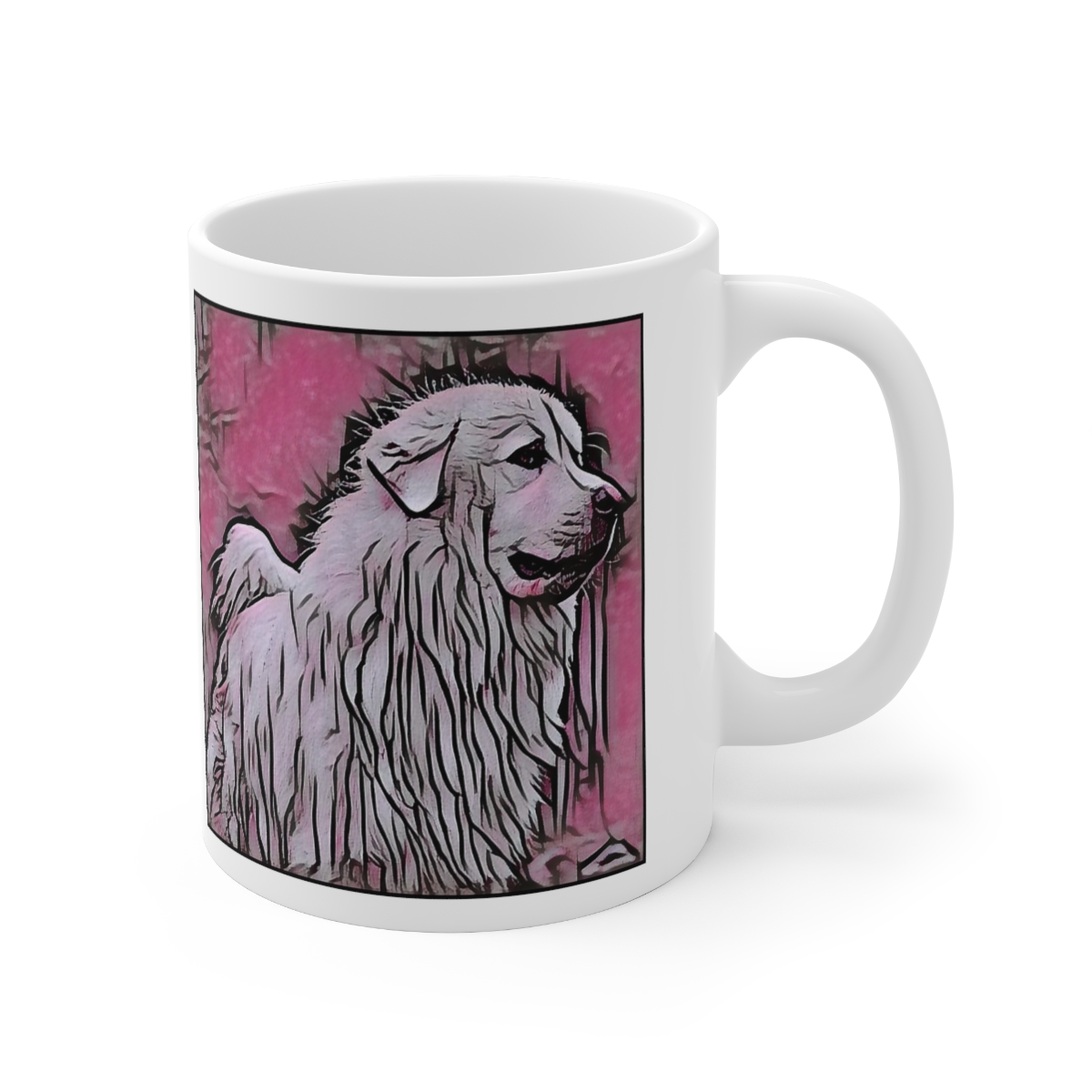 Keep cozy and warm with a nice cuppa, featuring the beloved Great Pyrenees dog breed stylized in our Coloromo Comic Pink art on a ceramic mug. Lead and BPA-free, these durable mugs are also microwave & dishwasher-safe. Made of white, resilient ceramic in an 11-ounce size, this is the perfect gift for coffee, tea, and hot chocolate lovers.
