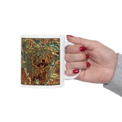 Keep cozy and warm with a nice cuppa, featuring the beloved Komondor dog breed stylized in our Coloromo Cool Cubist art on a ceramic mug. Lead and BPA-free, these durable mugs are also microwave & dishwasher-safe. Made of white, resilient ceramic in an 11-ounce size, this is the perfect gift for coffee, tea, and hot chocolate lovers.