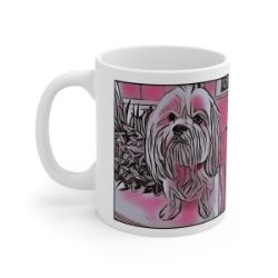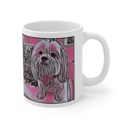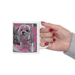 Keep cozy and warm with a nice cuppa, featuring the beloved Lhasa Apso dog breed stylized in our Coloromo Comic Pink art on a ceramic mug. Lead and BPA-free, these durable mugs are also microwave & dishwasher-safe. Made of white, resilient ceramic in an 11-ounce size, this is the perfect gift for coffee, tea, and hot chocolate lovers.