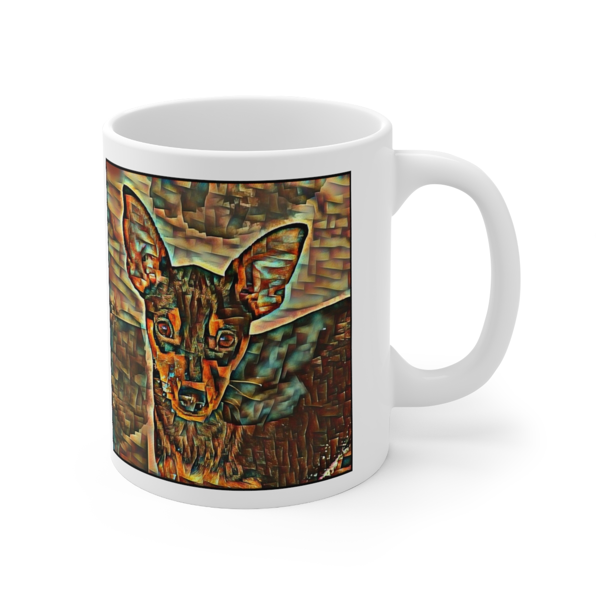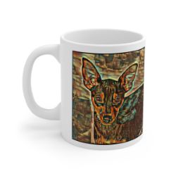 Keep cozy and warm with a nice cuppa, featuring the beloved Miniature Pinscher dog breed stylized in our Coloromo Cool Cubist art on a ceramic mug. Lead and BPA-free, these durable mugs are also microwave & dishwasher-safe. Made of white, resilient ceramic in an 11-ounce size, this is the perfect gift for coffee, tea, and hot chocolate lovers.