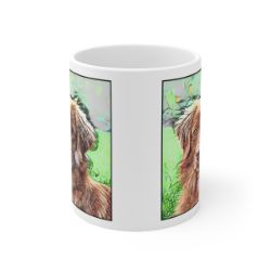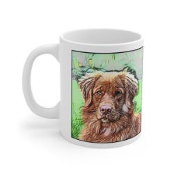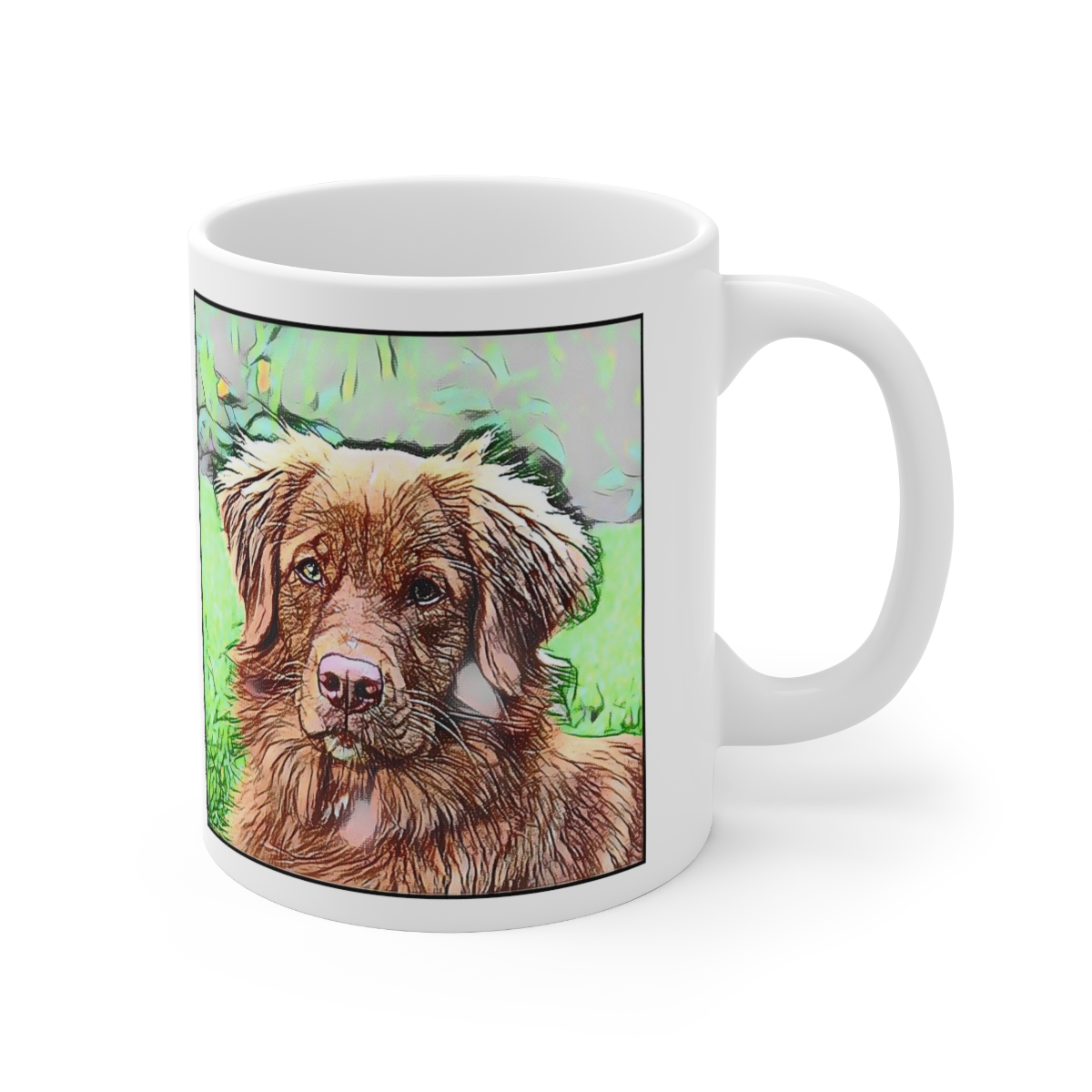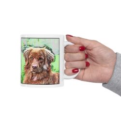 Keep cozy and warm with a nice cuppa, featuring the beloved Nova Scotia Duck Tolling Retriever dog breed stylized in our Coloromo Penciled In art on a ceramic mug. Lead and BPA-free, these durable mugs are also microwave & dishwasher-safe. Made of white, resilient ceramic in an 11-ounce size, this is the perfect gift for coffee, tea, and hot chocolate lovers.
