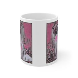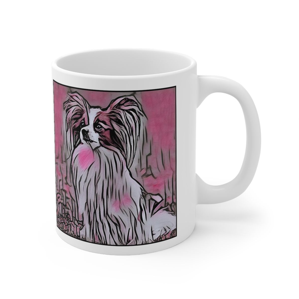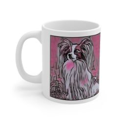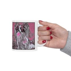 Keep cozy and warm with a nice cuppa, featuring the beloved Papillon dog breed stylized in our Coloromo Comic Pink art on a ceramic mug. Lead and BPA-free, these durable mugs are also microwave & dishwasher-safe. Made of white, resilient ceramic in an 11-ounce size, this is the perfect gift for coffee, tea, and hot chocolate lovers.