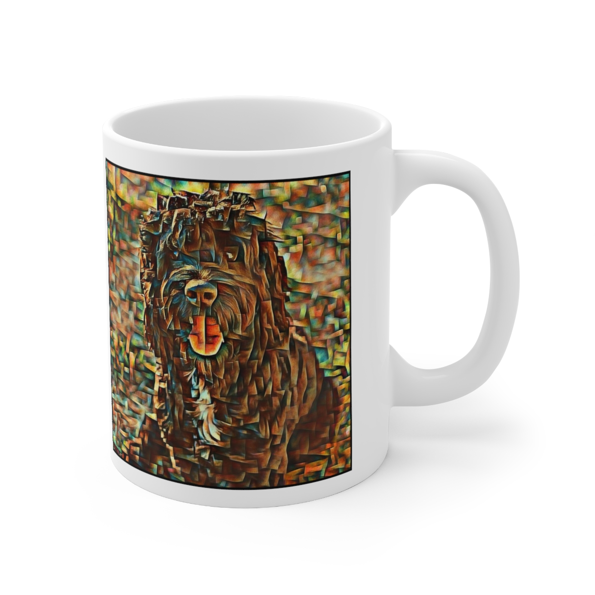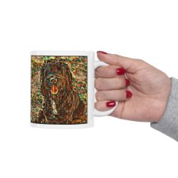 Keep cozy and warm with a nice cuppa, featuring the beloved Portuguese Water Dog dog breed stylized in our Coloromo Cool Cubist art on a ceramic mug. Lead and BPA-free, these durable mugs are also microwave & dishwasher-safe. Made of white, resilient ceramic in an 11-ounce size, this is the perfect gift for coffee, tea, and hot chocolate lovers.