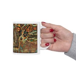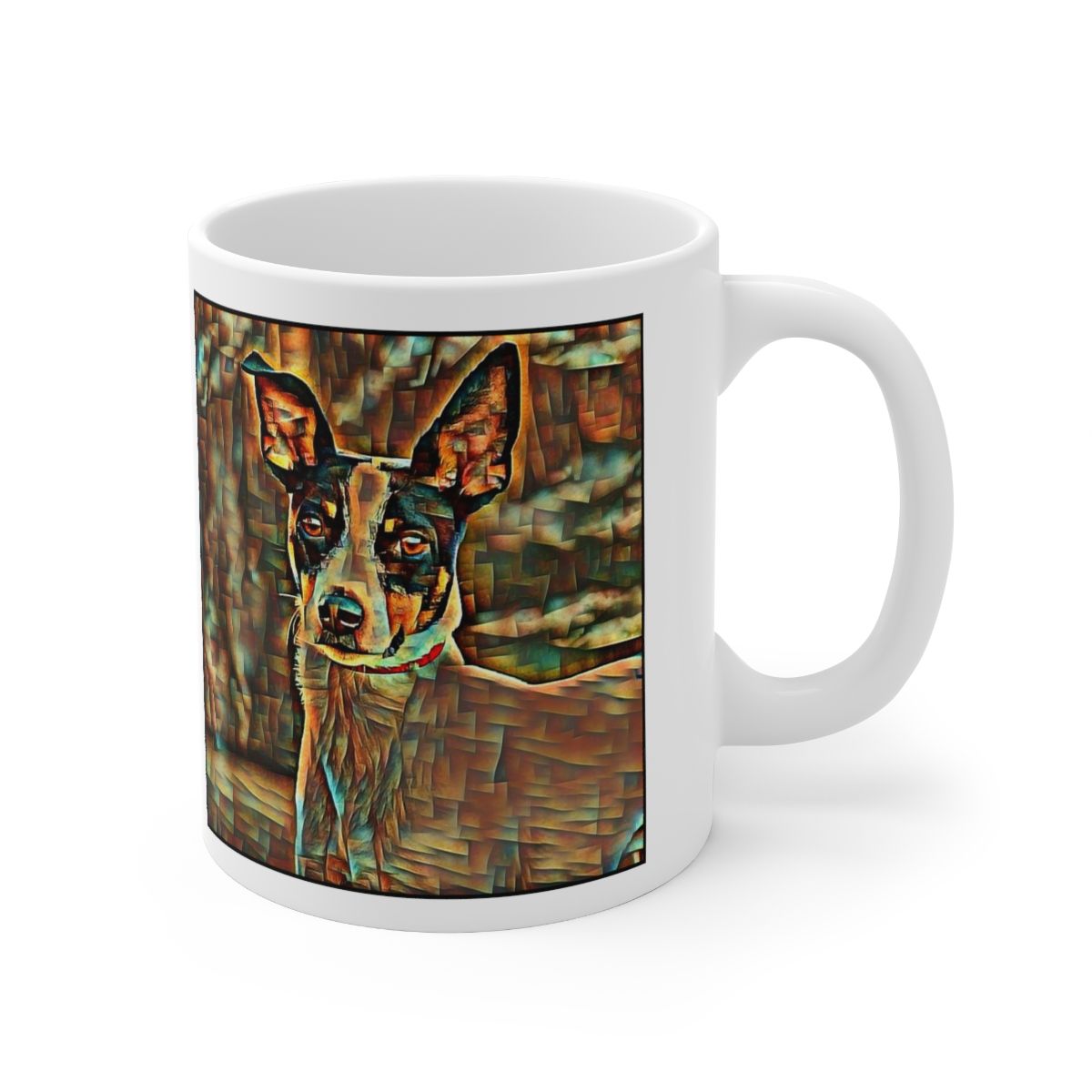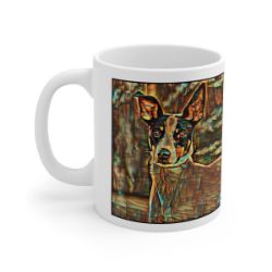 Keep cozy and warm with a nice cuppa, featuring the beloved Rat Terrier dog breed stylized in our Coloromo Cool Cubist art on a ceramic mug. Lead and BPA-free, these durable mugs are also microwave & dishwasher-safe. Made of white, resilient ceramic in an 11-ounce size, this is the perfect gift for coffee, tea, and hot chocolate lovers.