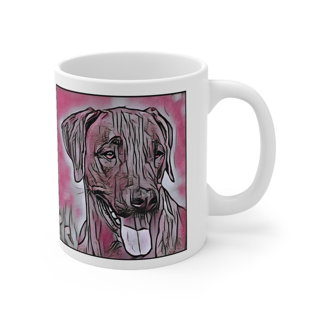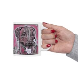 Keep cozy and warm with a nice cuppa, featuring the beloved Rhodesian Ridgeback dog breed stylized in our Coloromo Comic Pink art on a ceramic mug. Lead and BPA-free, these durable mugs are also microwave & dishwasher-safe. Made of white, resilient ceramic in an 11-ounce size, this is the perfect gift for coffee, tea, and hot chocolate lovers.