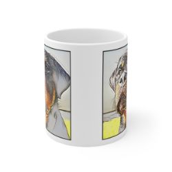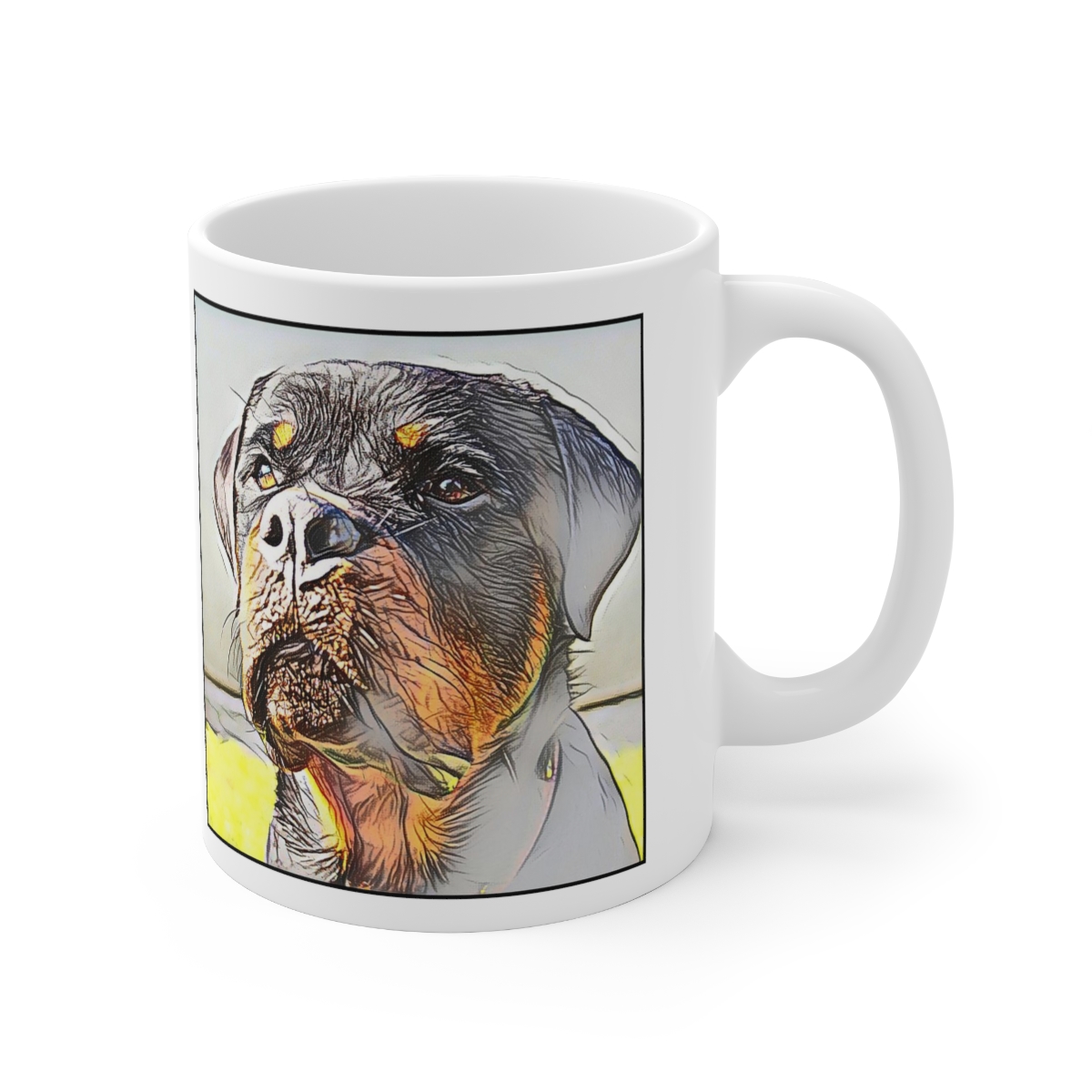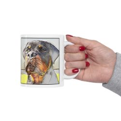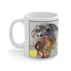 Keep cozy and warm with a nice cuppa, featuring the beloved Rottweiler dog breed stylized in our Coloromo Penciled In art on a ceramic mug. Lead and BPA-free, these durable mugs are also microwave & dishwasher-safe. Made of white, resilient ceramic in an 11-ounce size, this is the perfect gift for coffee, tea, and hot chocolate lovers.