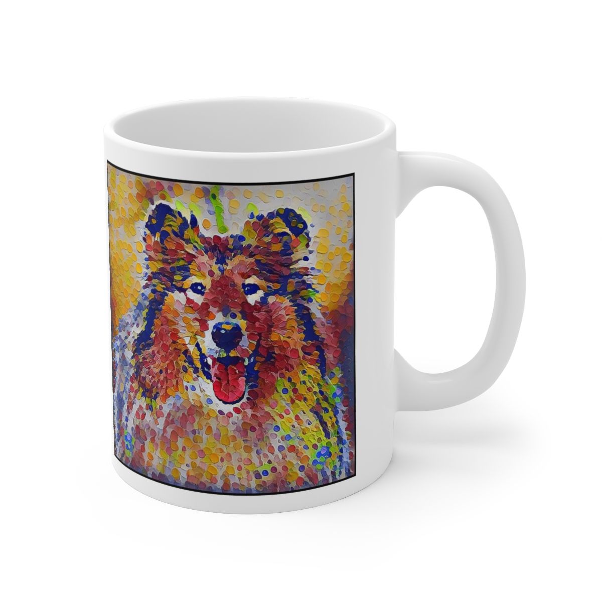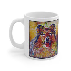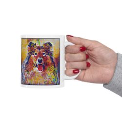 Keep cozy and warm with a nice cuppa, featuring the beloved Rough Collie dog breed stylized in our Coloromo Party Confetti art on a ceramic mug. Lead and BPA-free, these durable mugs are also microwave & dishwasher-safe. Made of white, resilient ceramic in an 11-ounce size, this is the perfect gift for coffee, tea, and hot chocolate lovers.