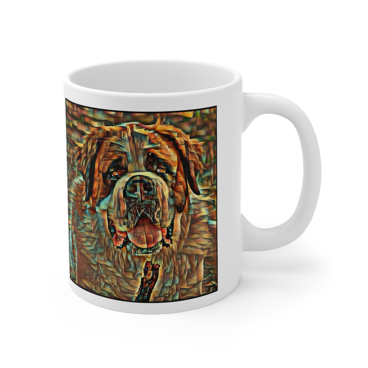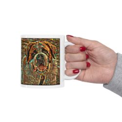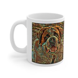 Keep cozy and warm with a nice cuppa, featuring the beloved Saint Bernard dog breed stylized in our Coloromo Cool Cubist art on a ceramic mug. Lead and BPA-free, these durable mugs are also microwave & dishwasher-safe. Made of white, resilient ceramic in an 11-ounce size, this is the perfect gift for coffee, tea, and hot chocolate lovers.