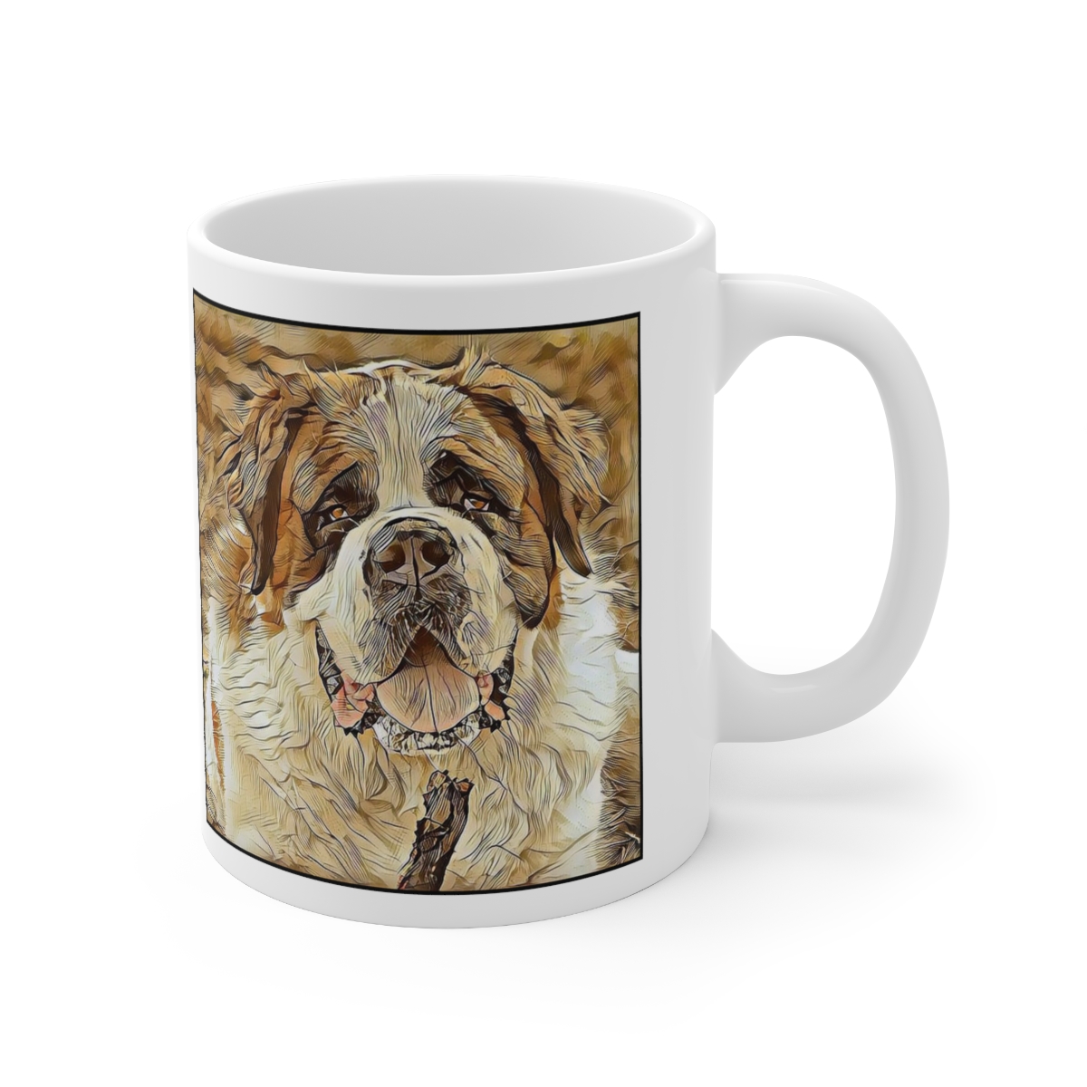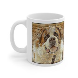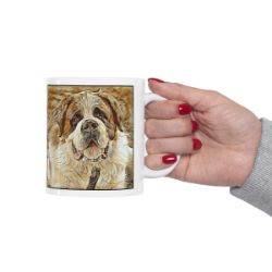 Keep cozy and warm with a nice cuppa, featuring the beloved Saint Bernard dog breed stylized in our Coloromo Hairy Styles art on a ceramic mug. Lead and BPA-free, these durable mugs are also microwave & dishwasher-safe. Made of white, resilient ceramic in an 11-ounce size, this is the perfect gift for coffee, tea, and hot chocolate lovers.