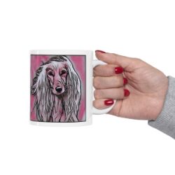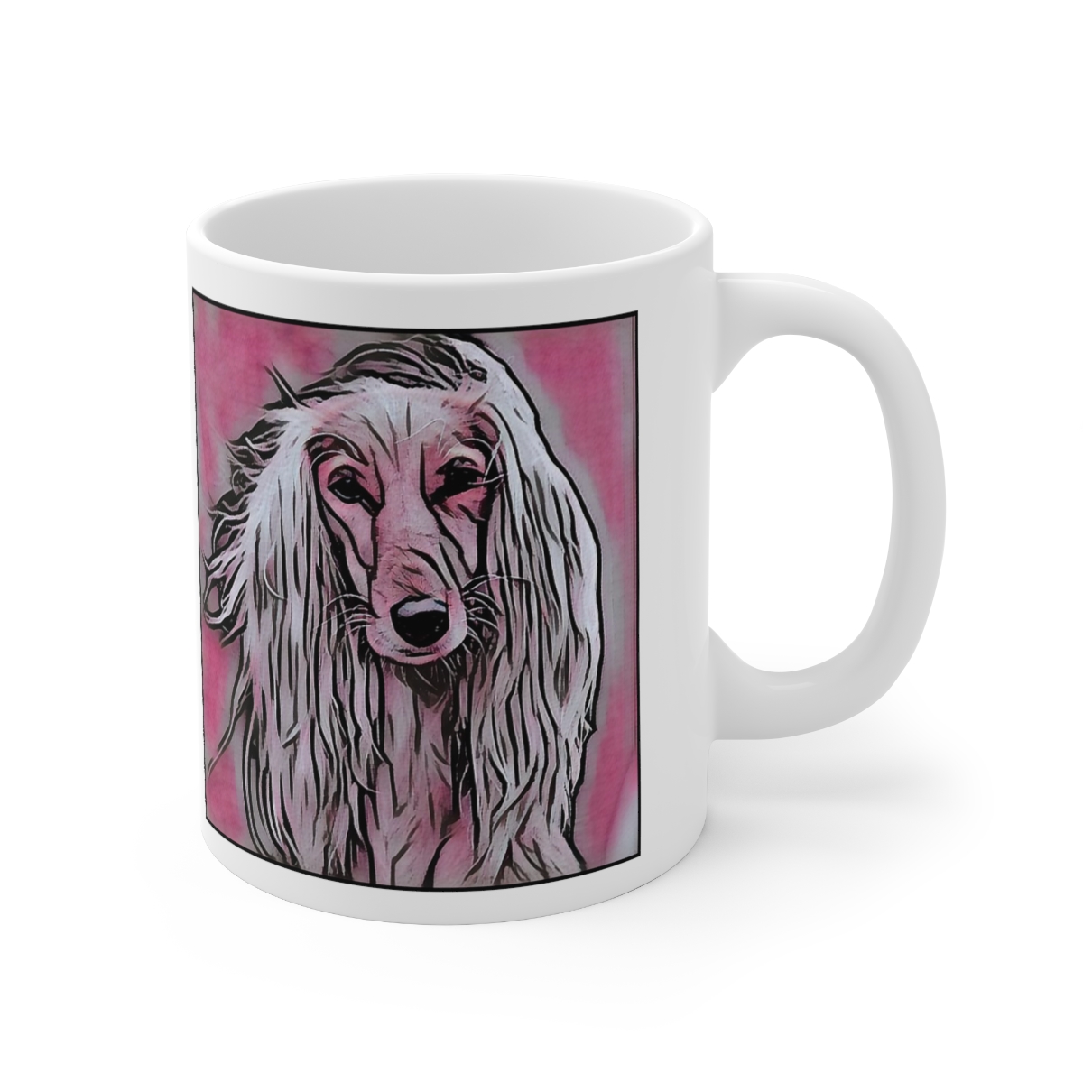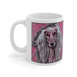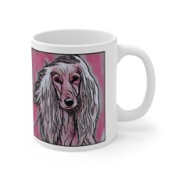 Keep cozy and warm with a nice cuppa, featuring the beloved Saluki dog breed stylized in our Coloromo Comic Pink art on a ceramic mug. Lead and BPA-free, these durable mugs are also microwave & dishwasher-safe. Made of white, resilient ceramic in an 11-ounce size, this is the perfect gift for coffee, tea, and hot chocolate lovers.