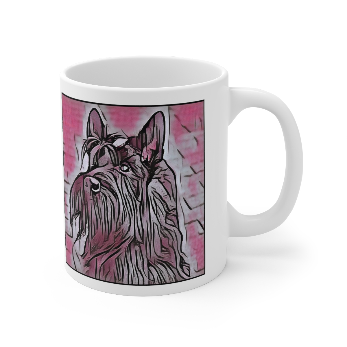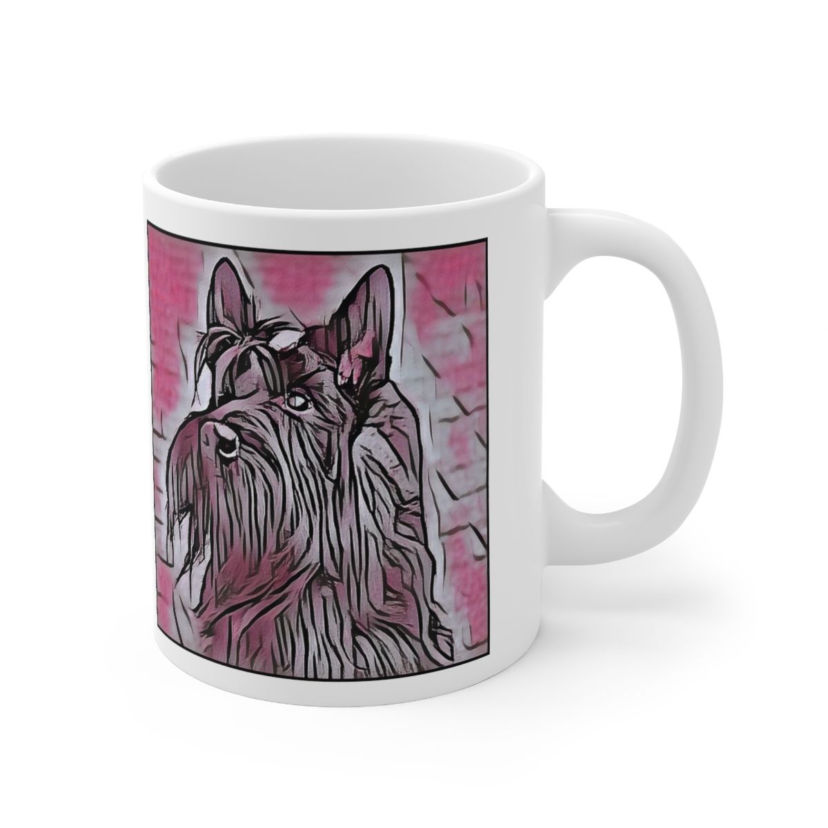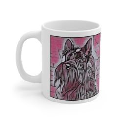 Keep cozy and warm with a nice cuppa, featuring the beloved Scottish Terrier dog breed stylized in our Coloromo Comic Pink art on a ceramic mug. Lead and BPA-free, these durable mugs are also microwave & dishwasher-safe. Made of white, resilient ceramic in an 11-ounce size, this is the perfect gift for coffee, tea, and hot chocolate lovers.